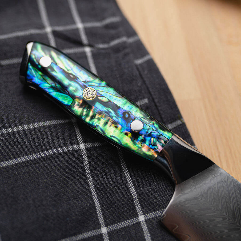 Experience this exquisite hand-forged: Gyuto Japanese Damascus Chef Knife. Crafted by mother nature at the heart of the ocean. This artisan knife is like no other. Featuring an exceptional abalone resin handle. It’s well-balanced and lightweight, forged with 67 layers of Damascus Steel with a VG-10 super steel core; making it razor sharp and strong.