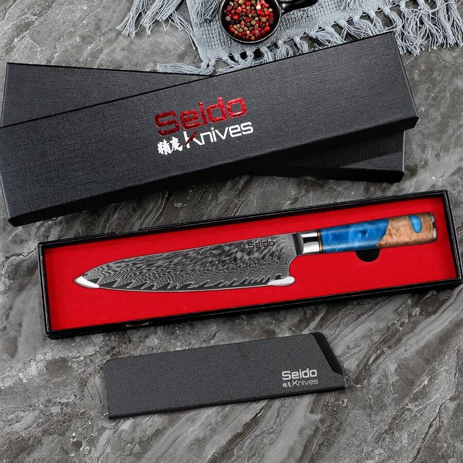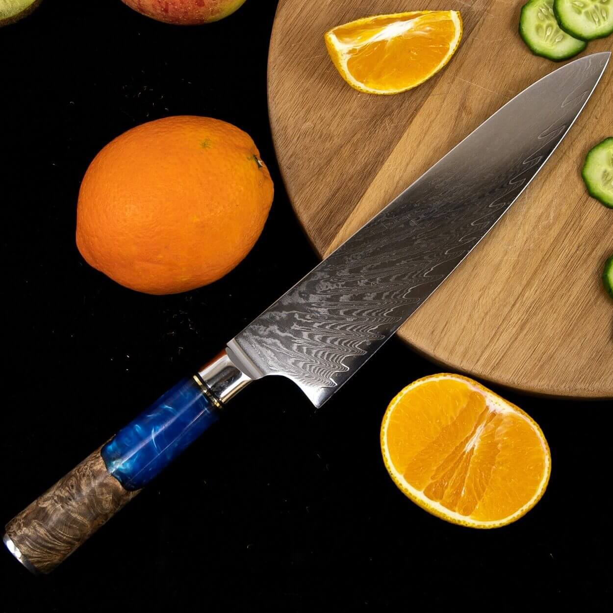 67 Layered Damascus steel with a VG-10 Super Steel core. This Japanese Executive Gyuto (Chef's) Knife has an 8" / 205mm razor sharp blade and a distinct blue resin, stabilized wooden handle.