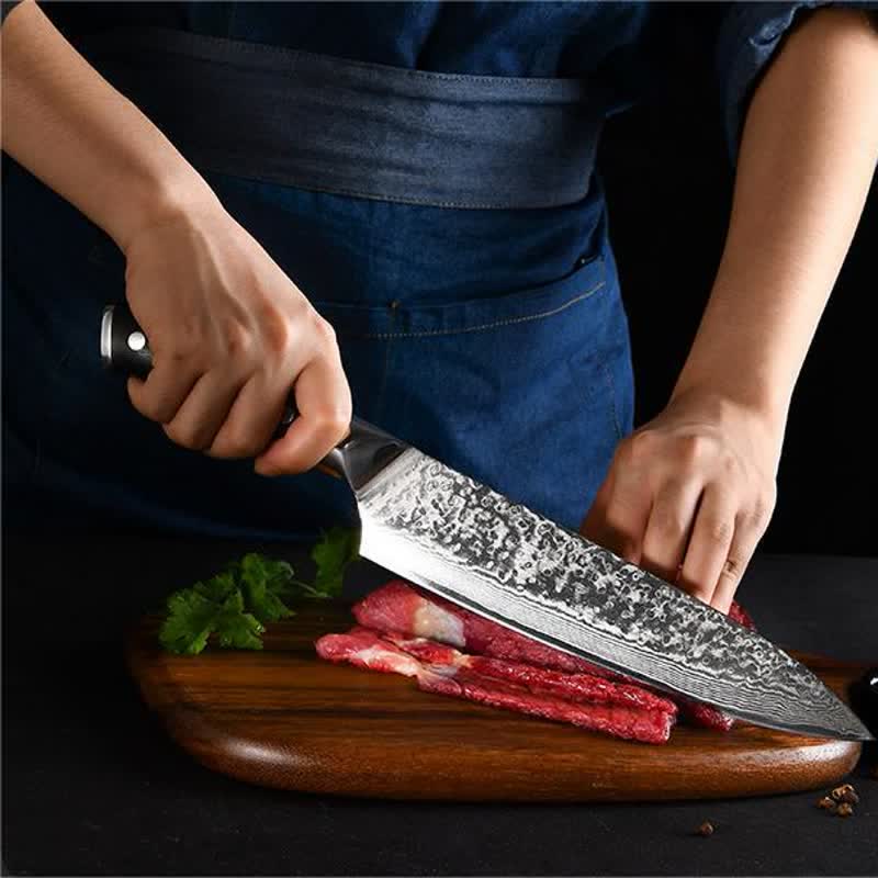 About Gyuto:Gyuto is another type of Japanese knife that makes perfect all-purpose cutters, slicers and kitchen knives. Although its blade is thin, it retains its length and circular shape, making it easy to cut meat, fish and vegetables. Its shape and thickness are achieved by the method of making a katana, which slices the fibers of food rather than crushing them. This makes it a very useful knife to keep meat fresh and lock in its flavor.