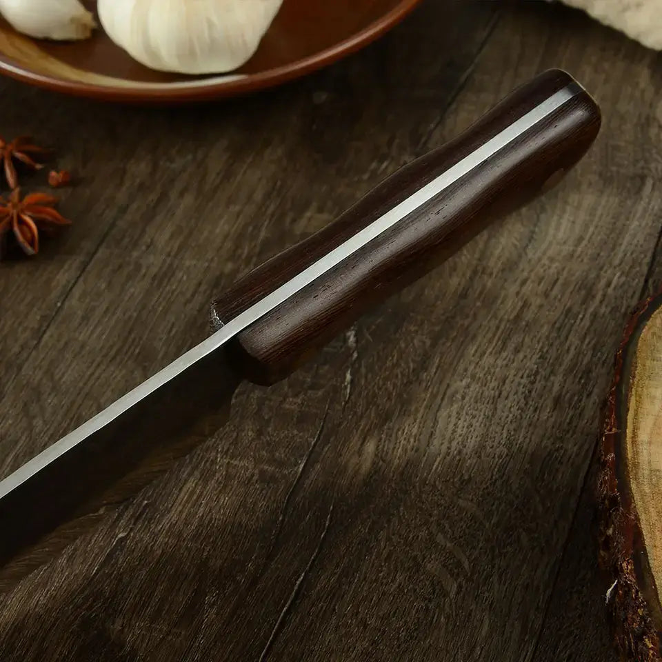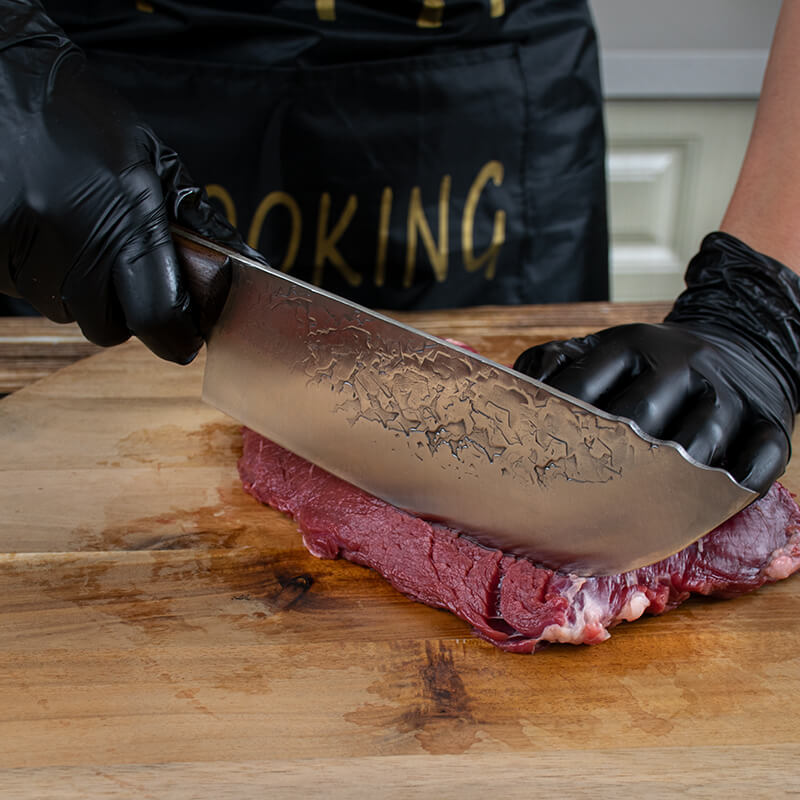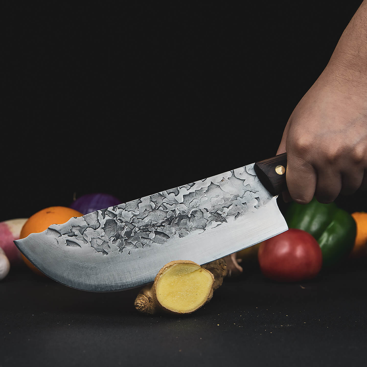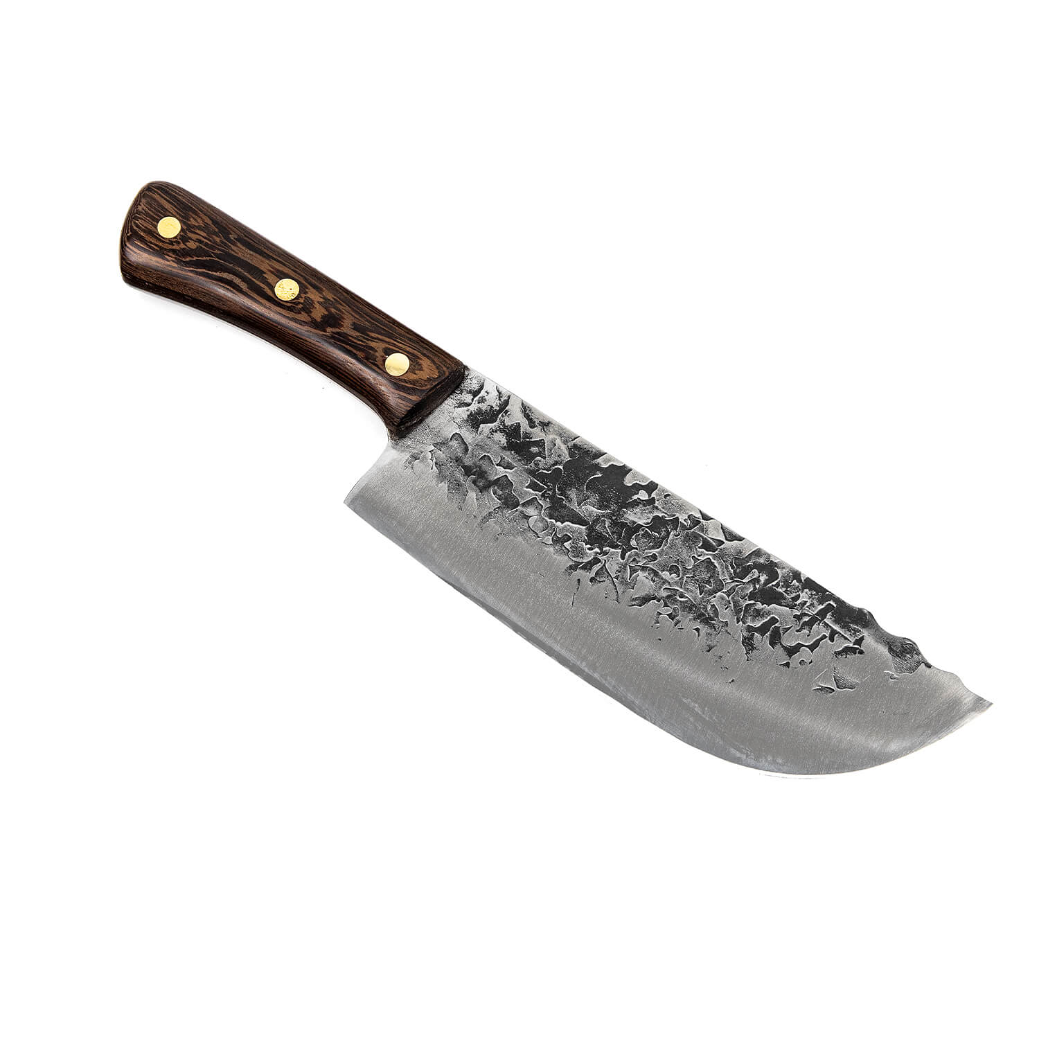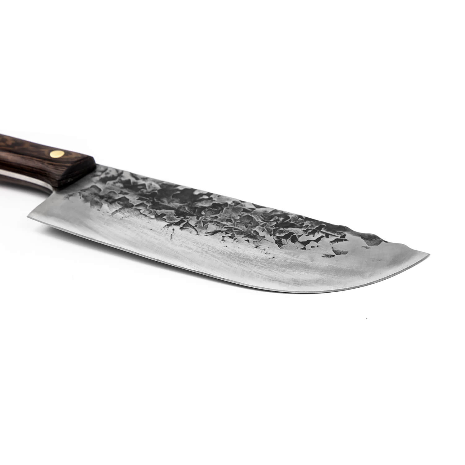 Introducing our signature artisan crafted, Nikuya Butcher Knife. This razor-sharp versatile blade is so sharp it can effortlessly cut through though meat and tackle any slicing task with ease. This handmade, full-tang butcher knife is well balanced and strong. This knife is excellent for slicing though meat, succulent BBQ and can even be used for chopping hardy vegetables. It's overall a versatile kitchen knife which can replace many knives in your kitchen.